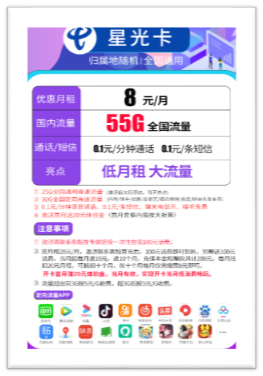 1. 资费:月租8元=25G全国通用流量+30G定向流量+0.1元/分钟通话+来电显示+激活首月送20元体验金