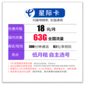 月租18元=33G全国通用流量+30G定向流量+300分钟通话+来电显示+激活首月送40元话费
