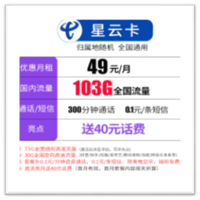 月租49元=73G全国通用流量+30G定向流量+300分钟通话+来电显示+激活首月送40元话费