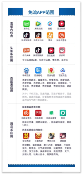 新版星卡套餐同样包含三大系列主流APP免流服务,适用范围包括头条系、百度系、网易系旗下多款主流APP,激活首月还将赠送话费/体验金。