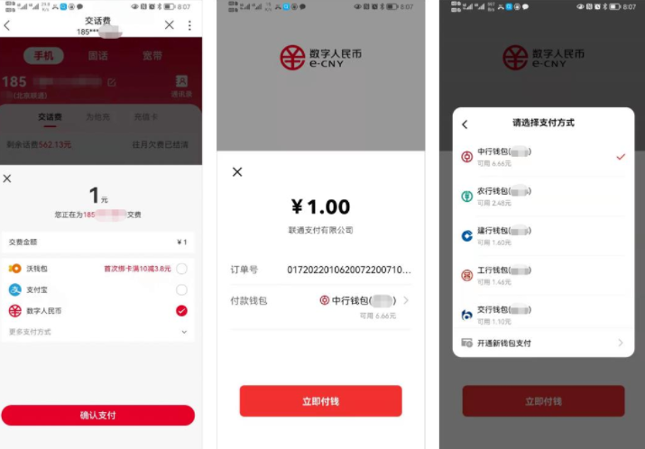 自2021年12月21日起,用户在中国联通APP交费充值时,已经可以看到数字人民币支付选项,并可通过拉起数字人民币APP方式进行支付。这是数字人民币试点以来,全国首个拉起数字人民币APP支付的线上场景。