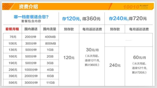中国联通将3G和4G的资费实行一体化,也就是说不再区分3G和4G的收费。其套餐资费分为8档,最低每月76元,国内语音、可视电话拨打时长为200分钟,国内流量为400MB