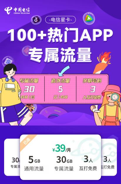 39元套餐内同样享受30G星卡用户专享的流量,相比29元卡,多了10元月租,但是多了5GB全国通用流量,相当于1G流量2元,从性价比上来讲30元卡要比20元卡更优惠。