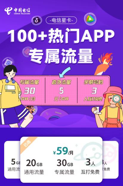 所以总体来59元卡是最适合年轻人,电信星卡超100款APP专属免流,年轻人当下喜欢的热门APP都包含在内。