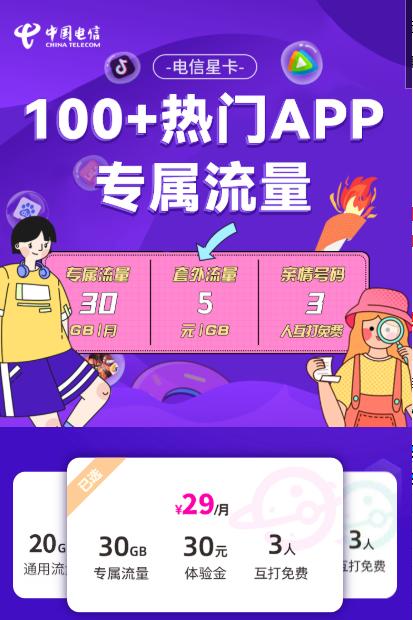 29元套餐内可享受30G星卡用户专享的流量,超过按照5元/GB收取流量费,流量包当月有效。